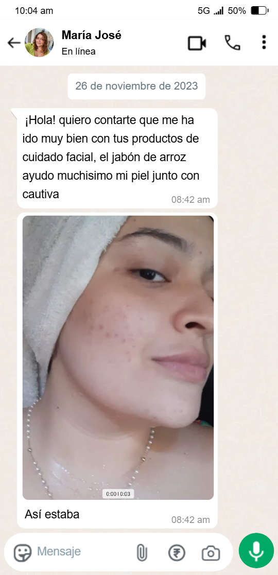 “¡Me encantó el jabón de arroz! En pocos días noté mi piel más clara y suave. Huele delicioso y no me irritó para nada.”
